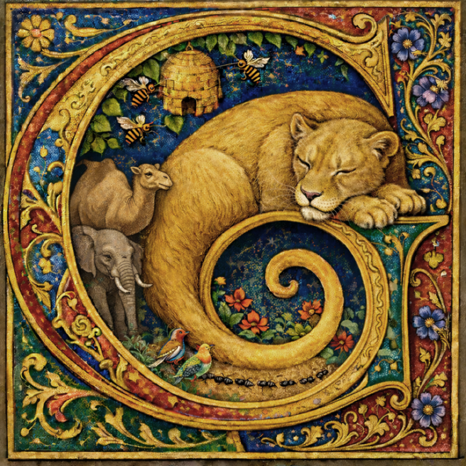 While the lioness rests on a serif raft before executing her craft only through hunger or boredom does she condescend to rise s t r e t c h scratch out a few choice words of conflict or change knead them with her switchblade claws then pause curl up on a tuft of italic grass in her tight cursive mass like a capital G to go back to sleep