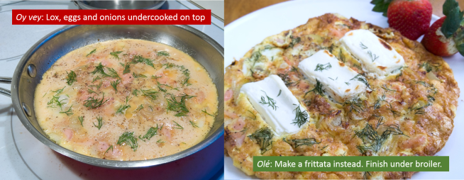The backstory: Lox and eggs and onions (always plural with ands between!) is a classic breakfast combo, typically made with Nova and not actual lox. But it is basically scrambled eggs, resulting in a delicious but unappetizing looking meal. You don’t want an omelet because the lox and onion should be spread throughout the egg mixture and not concentrated as a filling. You could try cooking on the stove top, then flipping it, but that’s messy. The solution is to make a frittata cooked or finished in the oven, a beautiful, puffy preparation that solves the problem of an undercooked top. It does take some care to get the frittata out of the pan. If you heat a non-stick pan prior to cooking, it becomes less sticky.